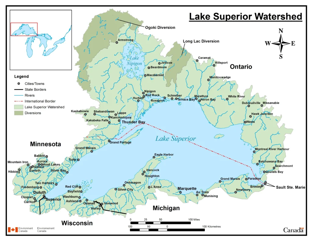 If you’re curious where Lake Superior is located, the northern shoreline lies entirely within Ontario, while the southern shore touches Michigan, Wisconsin, and Minnesota. As the largest of the Great Lakes, its size shapes the surrounding landscape, creating cool summers, snowy winters, and strong waves that make the lake feel more like an inland sea.